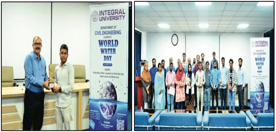 The Department of Civil Engineering at Integral University celebrated World Water Day 2024 on 22nd March 2024, focusing on “Accelerating Change” to address the global water and sanitation crisis .The main program on 22nd March featured an Expert Lecture by Er. Alok Kumar Sinha, highlighting the critical value of freshwater in health, nutrition, education, industry, and overall socio-economic development. He stressed that sustainable water management is essential for ensuring water availability for current and future generations. The lecture was attended by 24 students and concluded with a prize distribution ceremony for quiz winners.