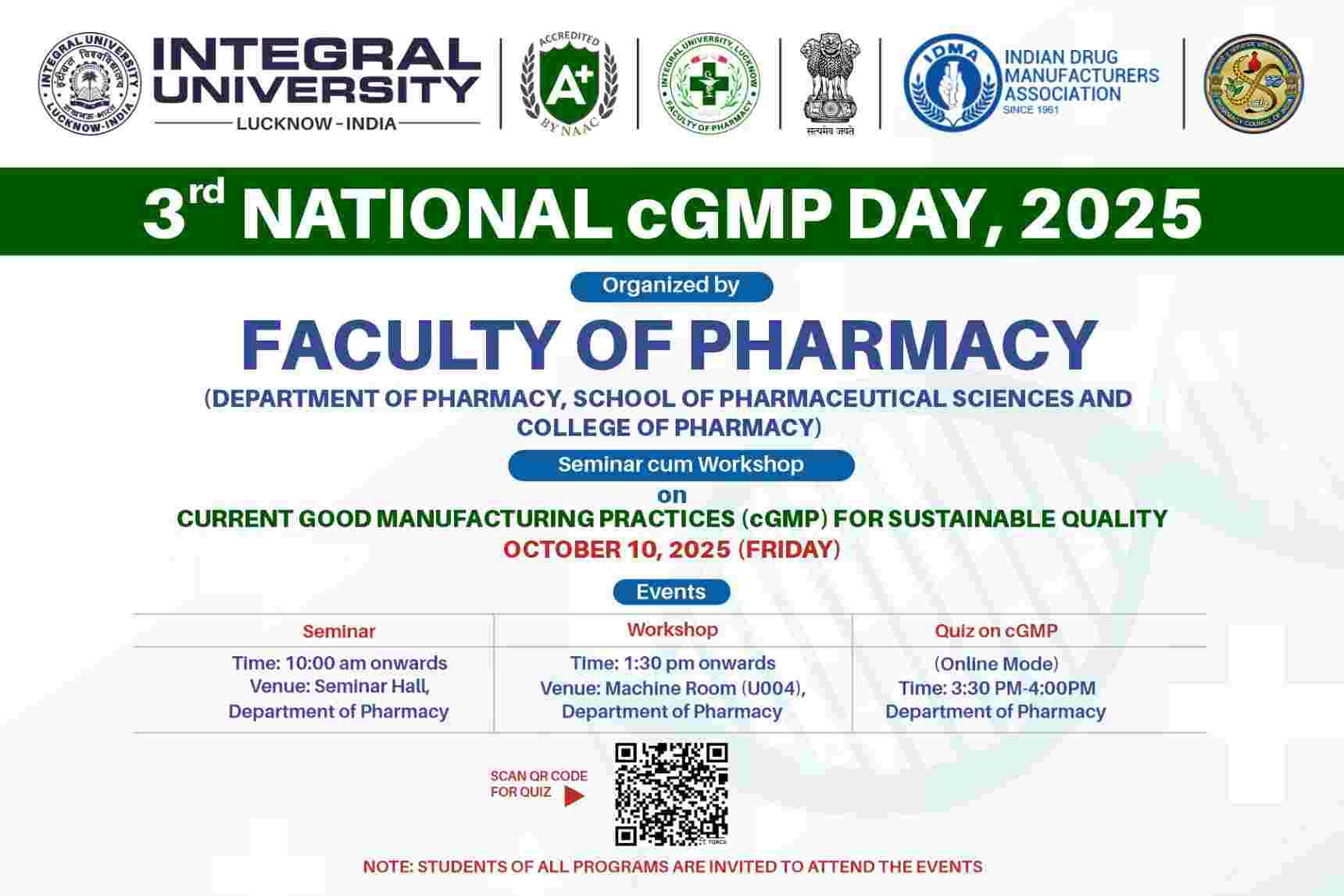 The Indian Drug Manufacturer’s Association (IDMA) initiated the concept of National cGMP day every year on October 10. To sensitize the students and faculty members concerning the role of cGMP in achieving sustainable quality. The Faculty of Pharmacy (Department of Pharmacy, School of Pharmaceutical Sciences, and College of Pharmacy, Integral University, Lucknow) will organize afore mentioned events on this occasion.