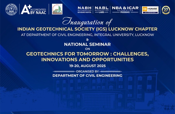 The Department of Civil Engineering, Integral University, Lucknow, is pleased to announce the National Seminar on “Geotechnics for Tomorrow: Challenges, Innovations, and Opportunities”, will be held on 19-20 August 2025 at the Central Auditorium, Integral University, Lucknow.