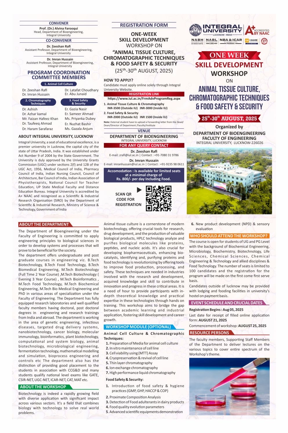 This workshop is designed to provide in-depth theoretical knowledge and hands-on training in modern biotechnology and food safety techniques. It aims to bridge the gap between academic learning and industrial applications, helping students enhance their research and professional skills.