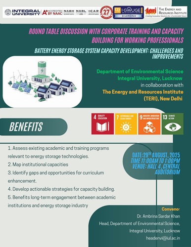 The Department of Environmental Science, Integral University, Lucknow, in collaboration with The Energy and Resources Institute (TERI), is organizing a Roundtable Discussion with Industry Professionals and Academicians on 29th August 2025 at 11:00am to 1:00pm in Hall 4 of Central Auditorium on the theme: