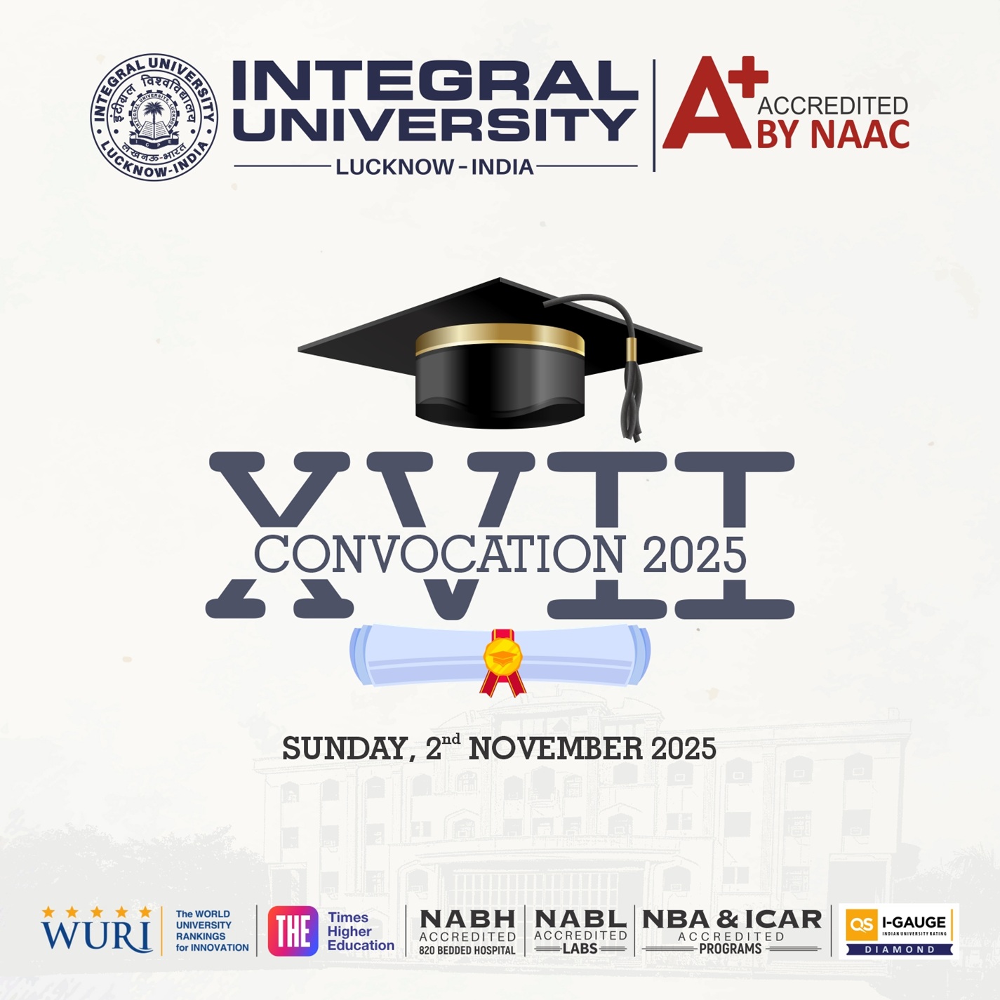 Integral University, Lucknow, proudly announces its 17th Convocation Ceremony — a prestigious occasion that marks the culmination of dedication, perseverance, and success. Join us as we celebrate the achievements of our graduates who are ready to shape the future with knowledge, innovation, and leadership.
